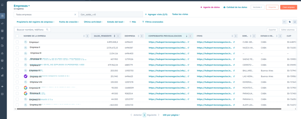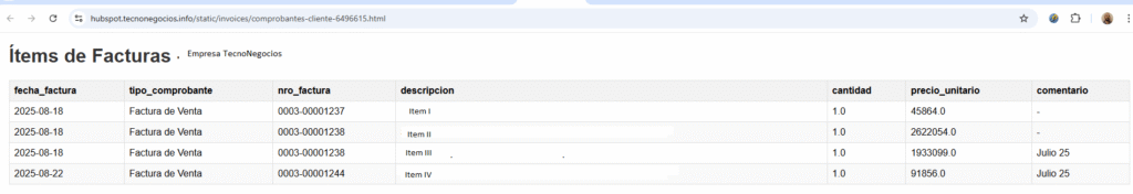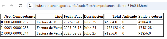 Almacenamiento: finalmente se almacenan en cada empresa en Hubspot 2 url con los comprobantes pendientes, y con los items vendidos (en los ultimos 120 dias).